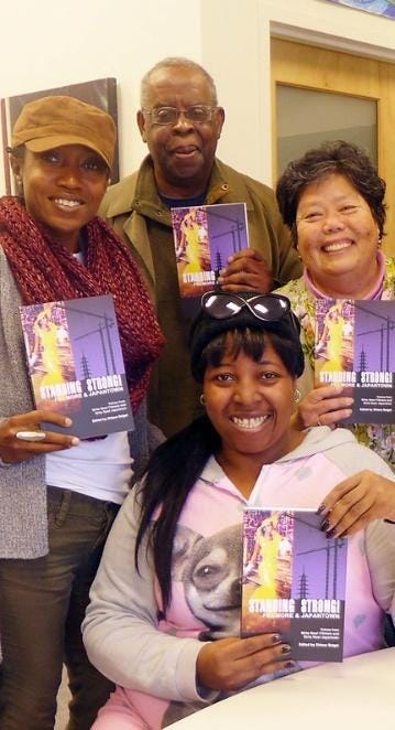 Driven to share stories of real people, Shizue began applying for San Francisco Arts Commission grants to publish anthologies, each with particular focus. Her first anthology presents prose, poetry and visual art by 34 contributing writers and artists exploring overlapping histories of migration, incarceration and displacement in the city’s Western Addition, a culturally rich hub for Japanese American and African American residents. The area survived the massive 1906 earthquake, but not the city’s move in the early 1970s to eradicate “blighted slums.” Old Victorians were razed, and many thousands of people of color, living together in community, were displaced.
