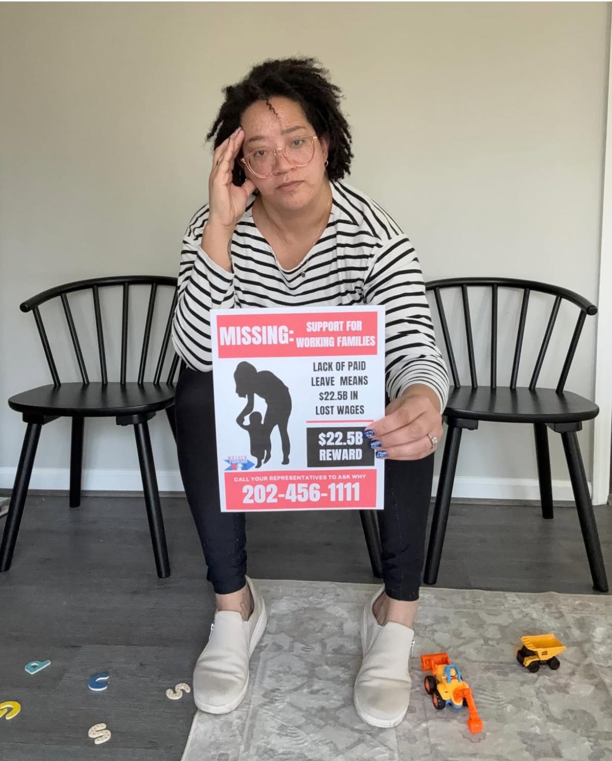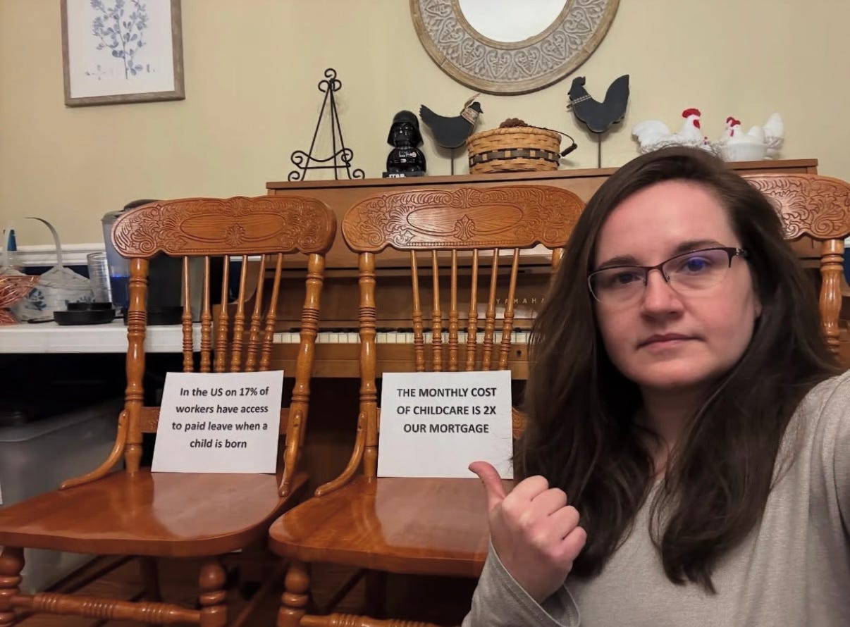 When she and two other moms met with legislative aides last month to ask why this new “pro-family” administration has failed to introduce any family-supporting policies in its first 100 days, they brought this imagery of empty chairs with them. “We said: Look, we would have planned for a full meeting, but there’s always moms who can’t show up because we aren't supporting them.”