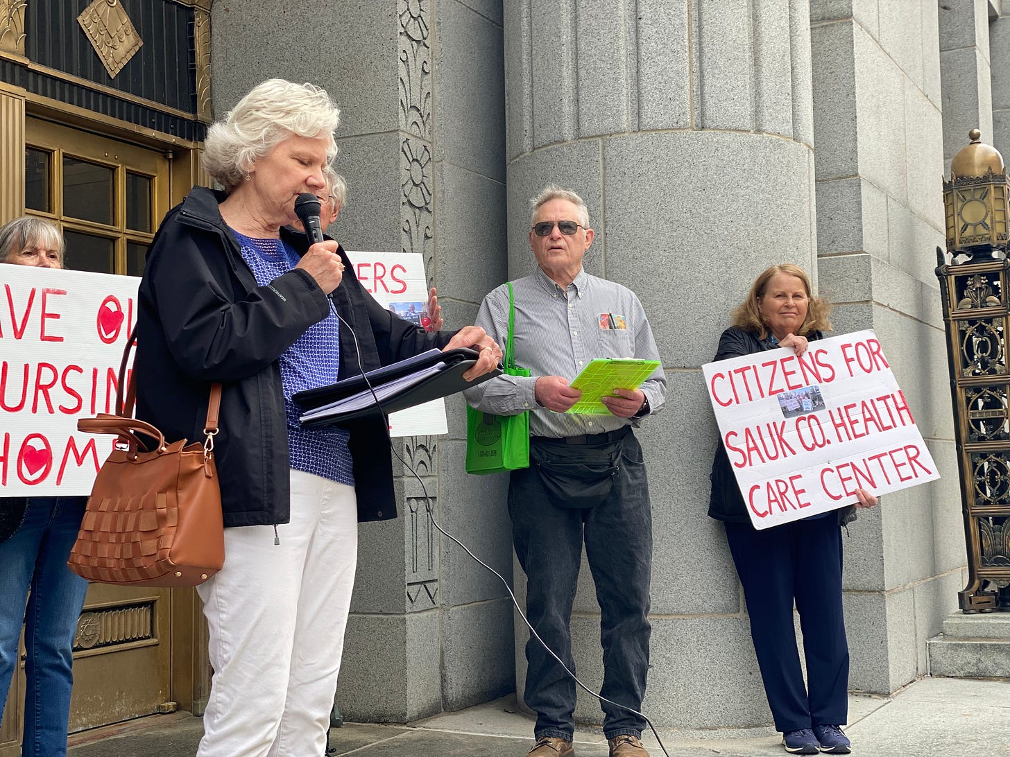 Judy Brey wasn’t the only person in Sauk County who wanted to save the county-owned nursing home from being sold to a for-profit business. Soon, a small group formed, calling themselves Citizens for Sauk County Health Care Center. Setting up in local parking lots, they circulated a petition opposing the sale. They collected money to run ads in the local paper, hosted “call-in” days, and made t-shirts to wear at Board of Supervisors meetings.